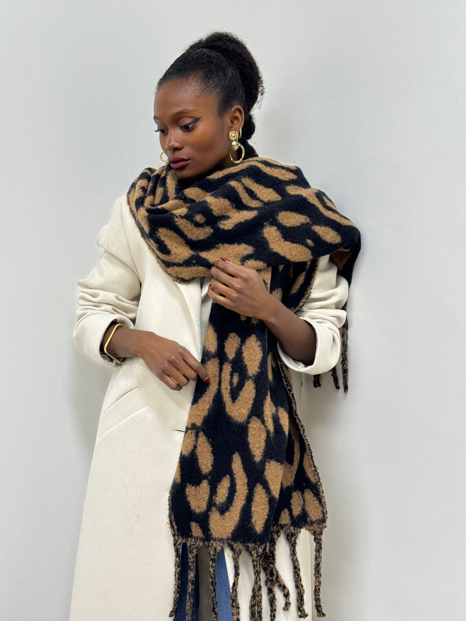 Sciarpa animalier con dettaglio di frange.