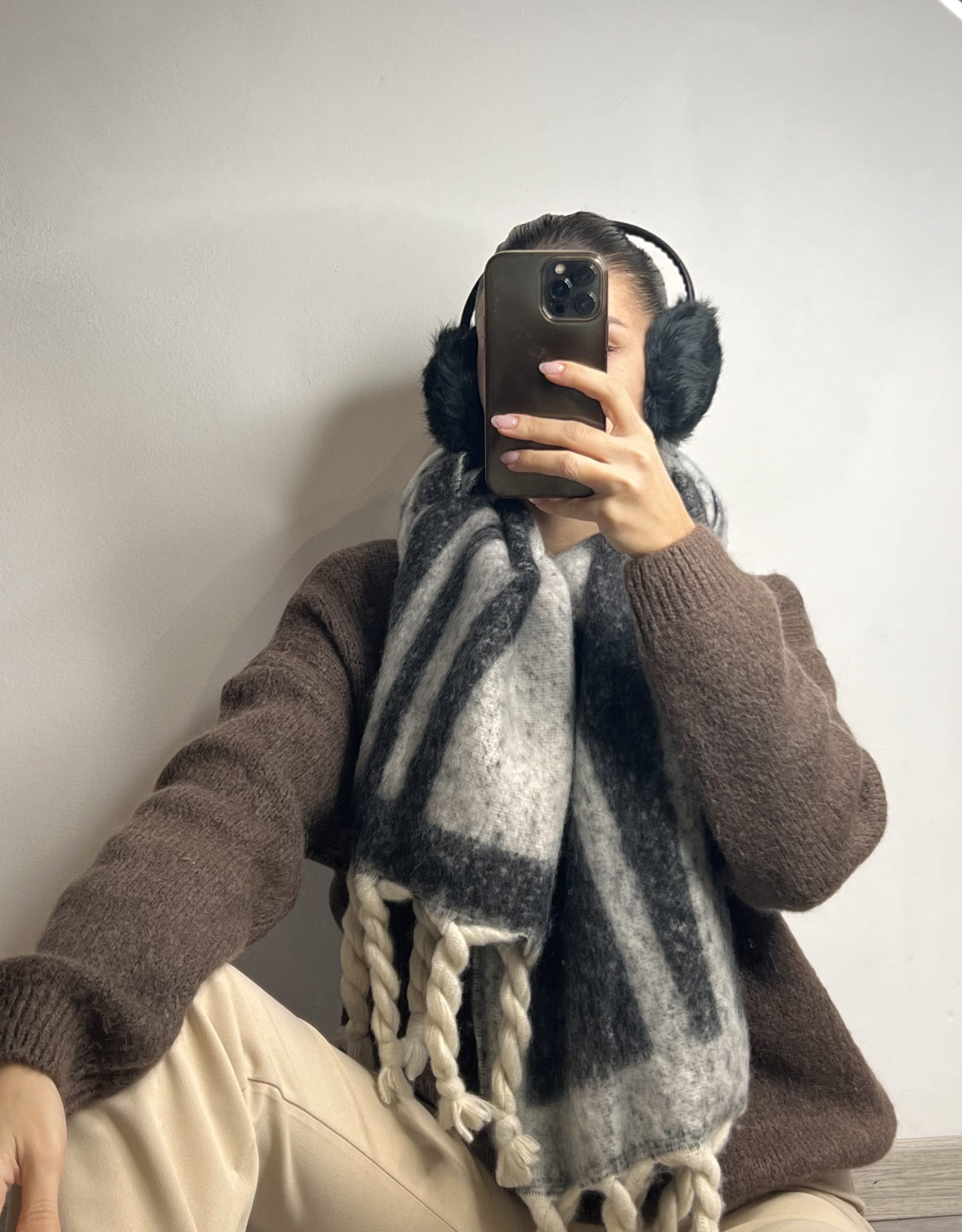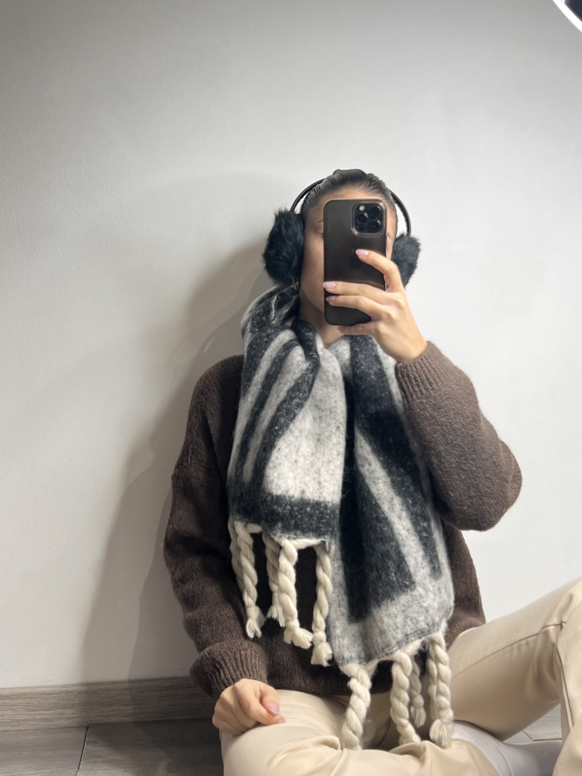 Sciarpa morbida con dettaglio di frange intrecciate sulla parte finale.