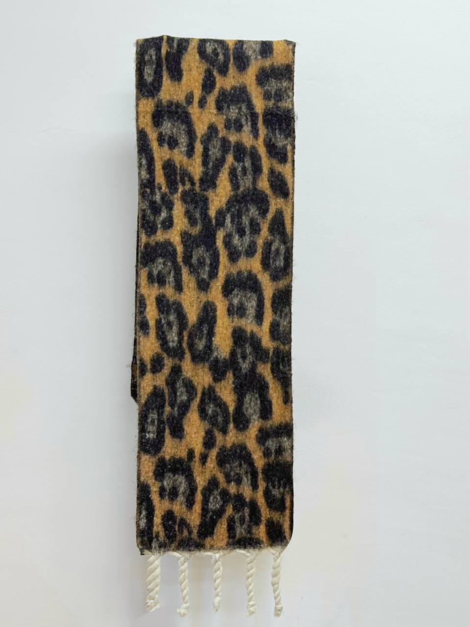 Realizzata in misto viscosa e cotone, questa sciarpa unisce morbidezza e leggerezza a uno stile deciso. La stampa animalier nei toni del nero è illuminata da tocchi di camel su tutta la lunghezza, che donano un contrasto elegante e femminile. Il design è completato da sottili frange intrecciate color crema, lavorate con cura per aggiungere movimento e un dettaglio artigianale all’accessorio.