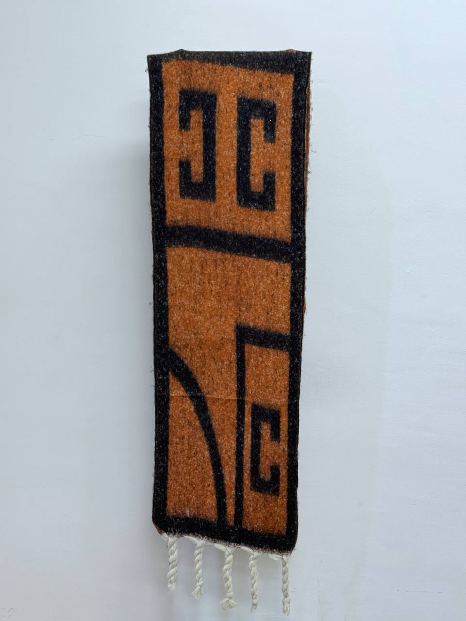 Questa sciarpa presenta una stampa geometrica astratta, caratterizzata da ampie strisce curve che si intrecciano con forme squadrate, creando un motivo dinamico e di forte impatto visivo. La palette combina i toni profondi del nero con le sfumature calde del ruggine, per un effetto moderno ed elegante.