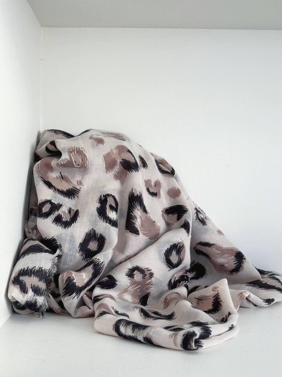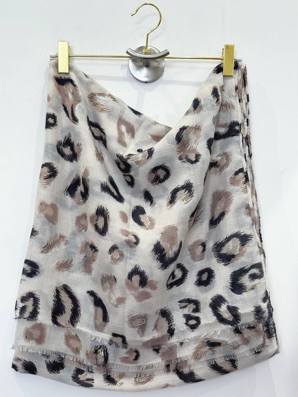 Sciarpa con fantasia maculata che ricorda il manto di un leopardo. Le macchie sono di tonalità scure alternate a macchie più chiare e sfumate.