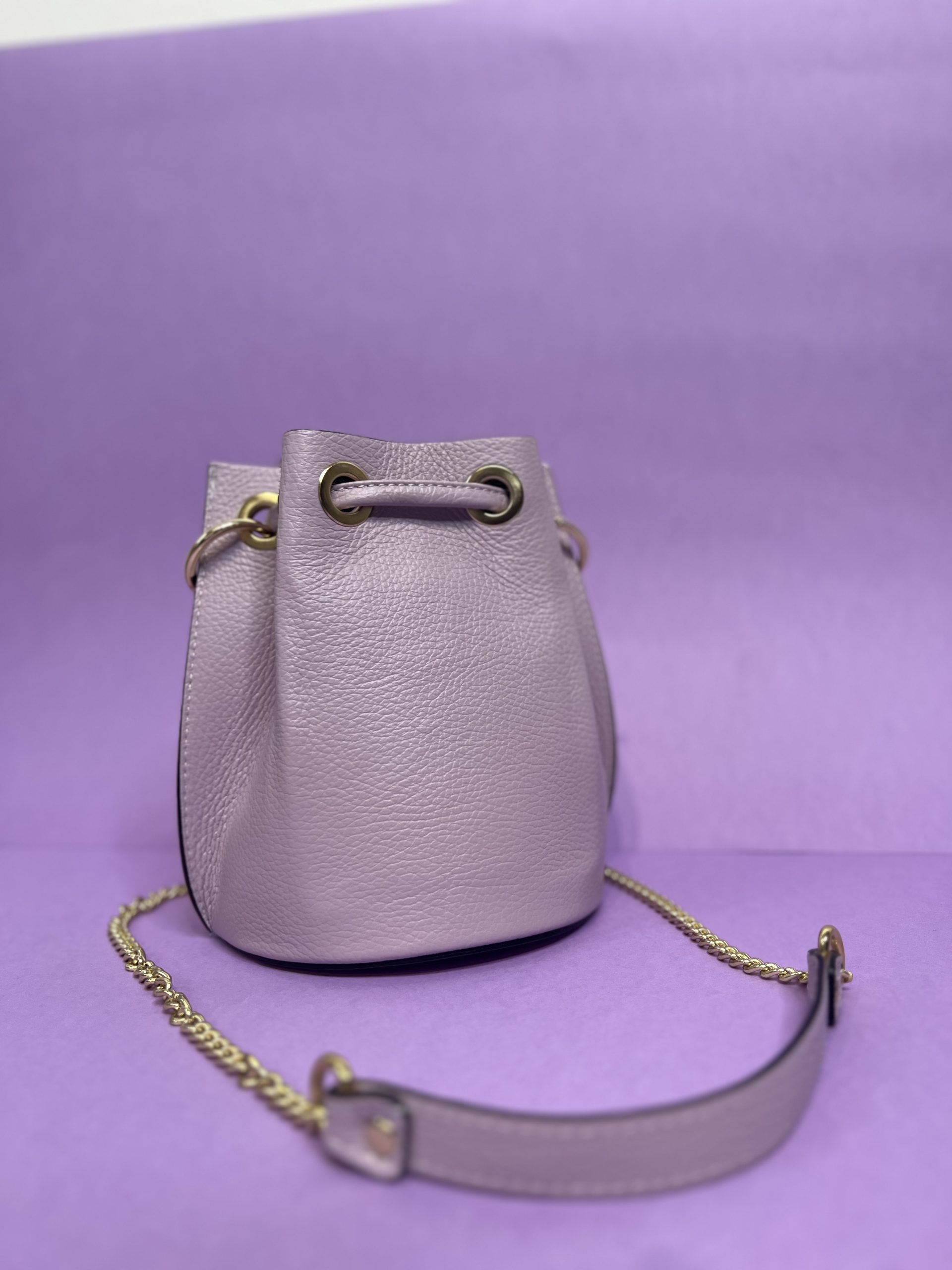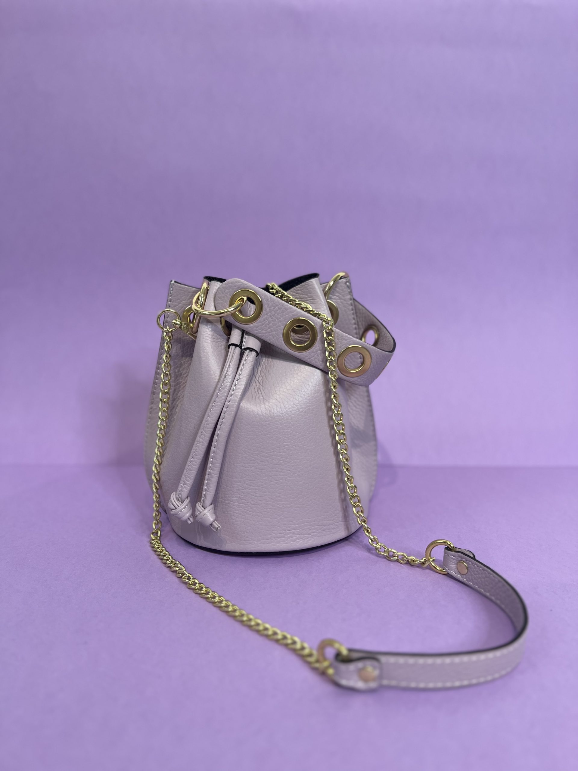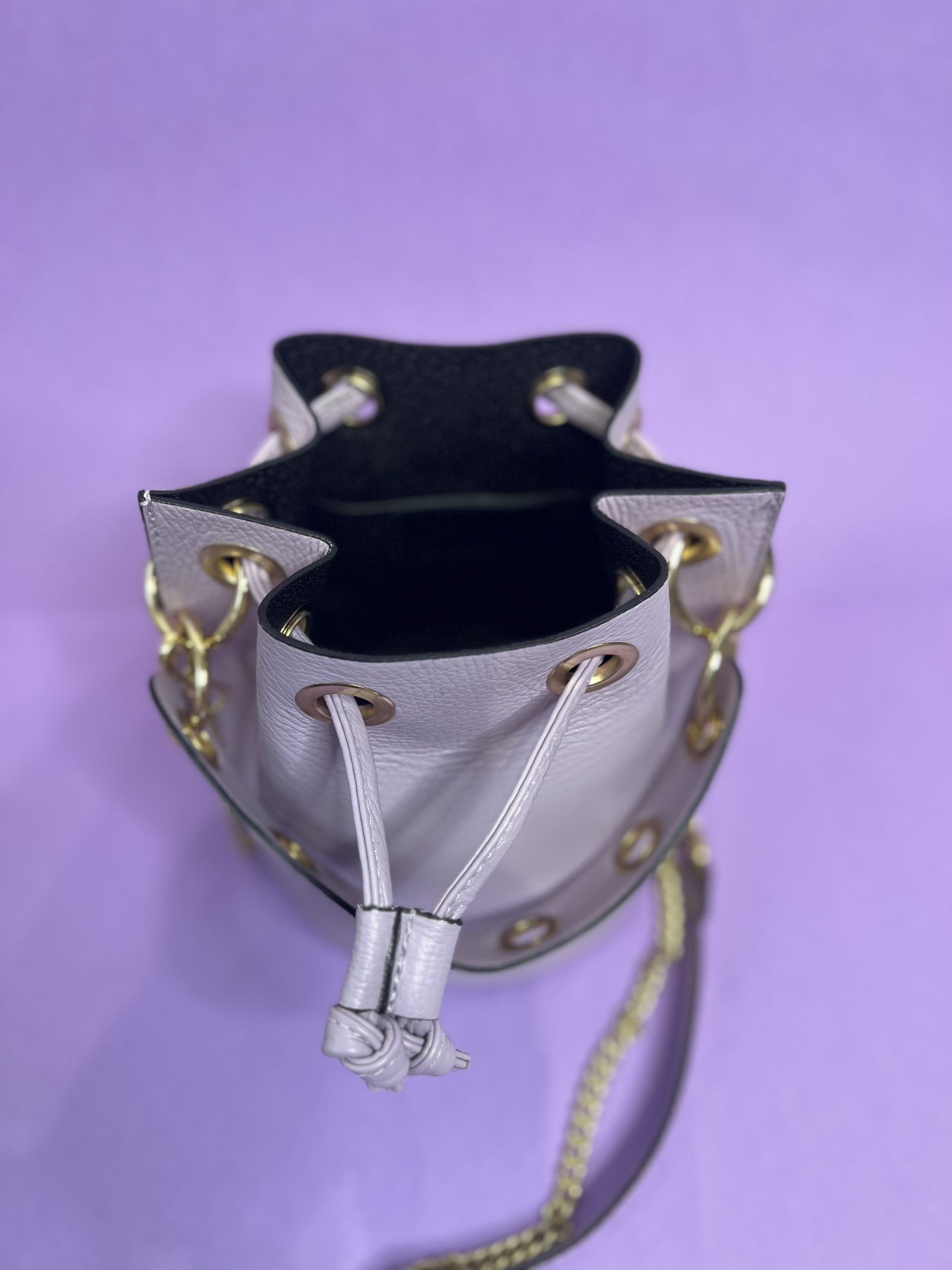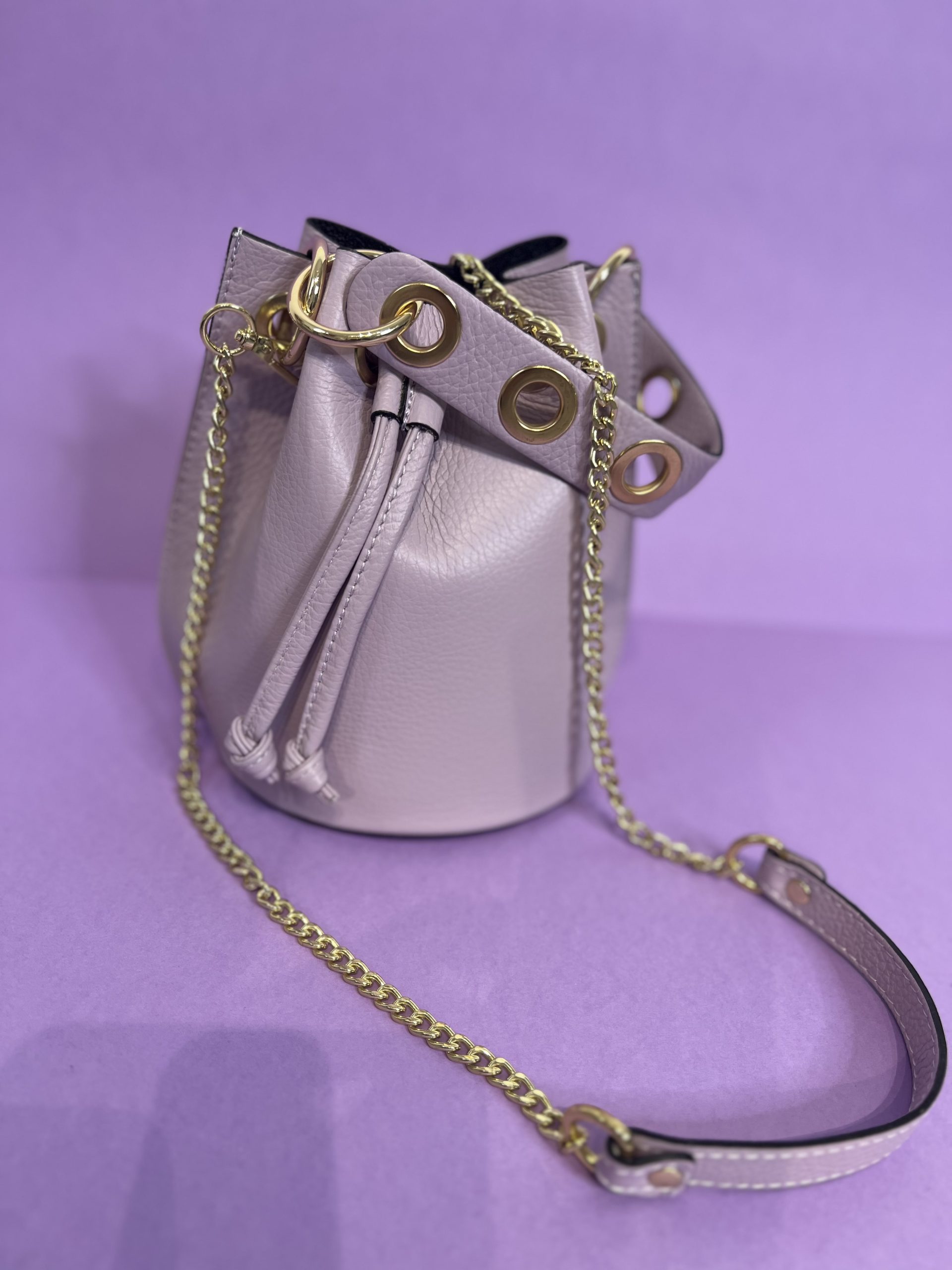 Borsa a secchiello con dettaglio di catena d’oro in vera pelle.