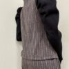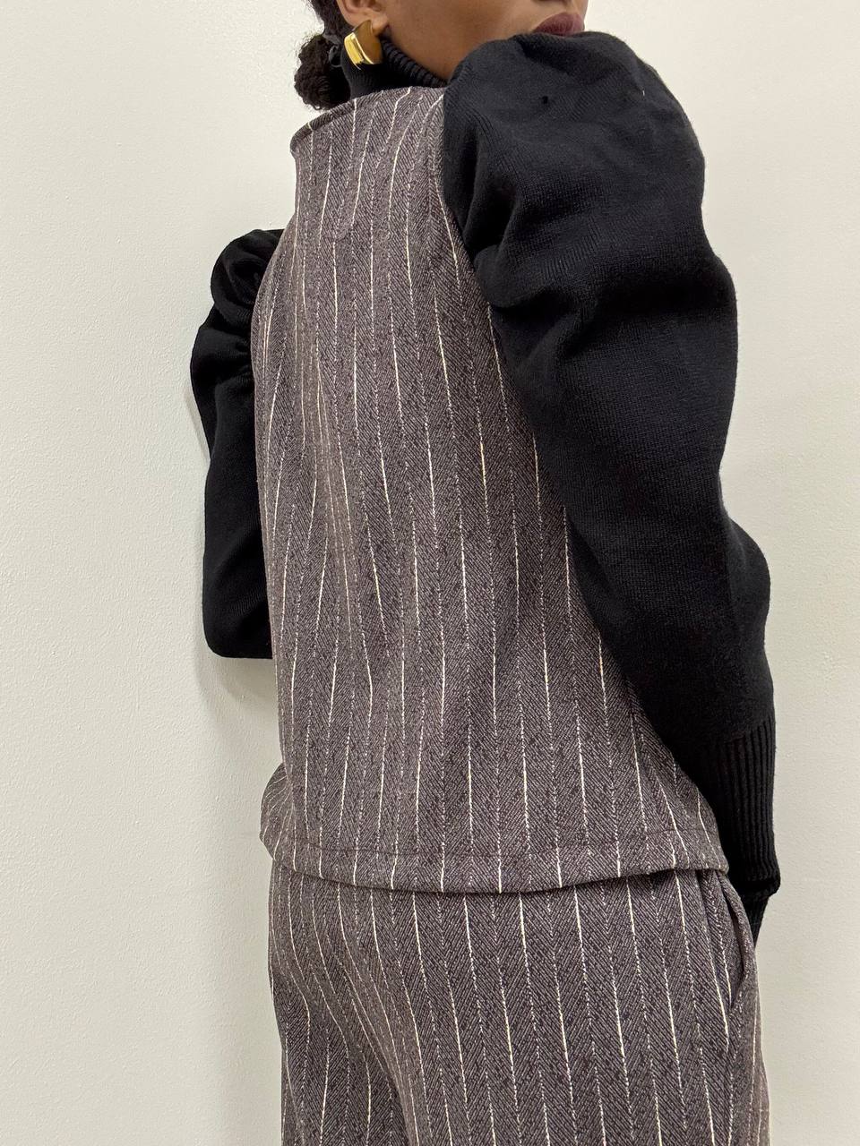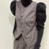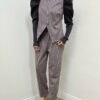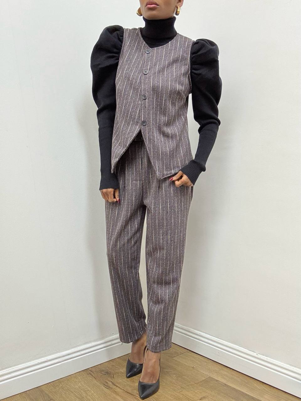Completo dal gusto sartoriale e contemporaneo, composto da gilet smanicato gessato e pantalone coordinato. Il gilet presenta una linea pulita ed elegante, con chiusura centrale a quattro bottoni che ne esalta la struttura e la vestibilità, richiamando uno stile classico rivisitato in chiave moderna.