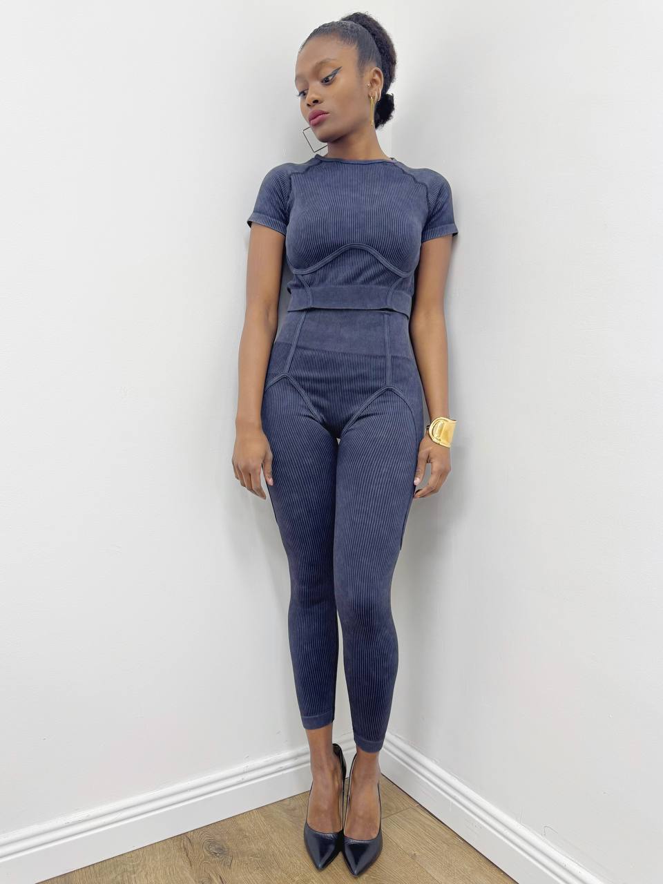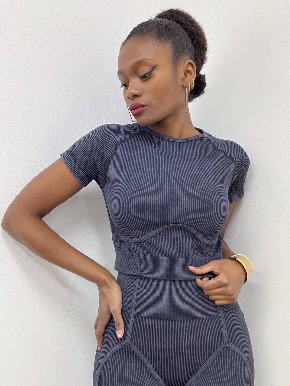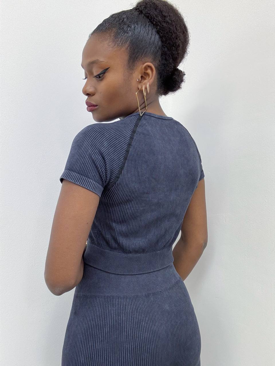 Maglia a manica corta a girocollo a costine a tinta unita. Elasticizzata.