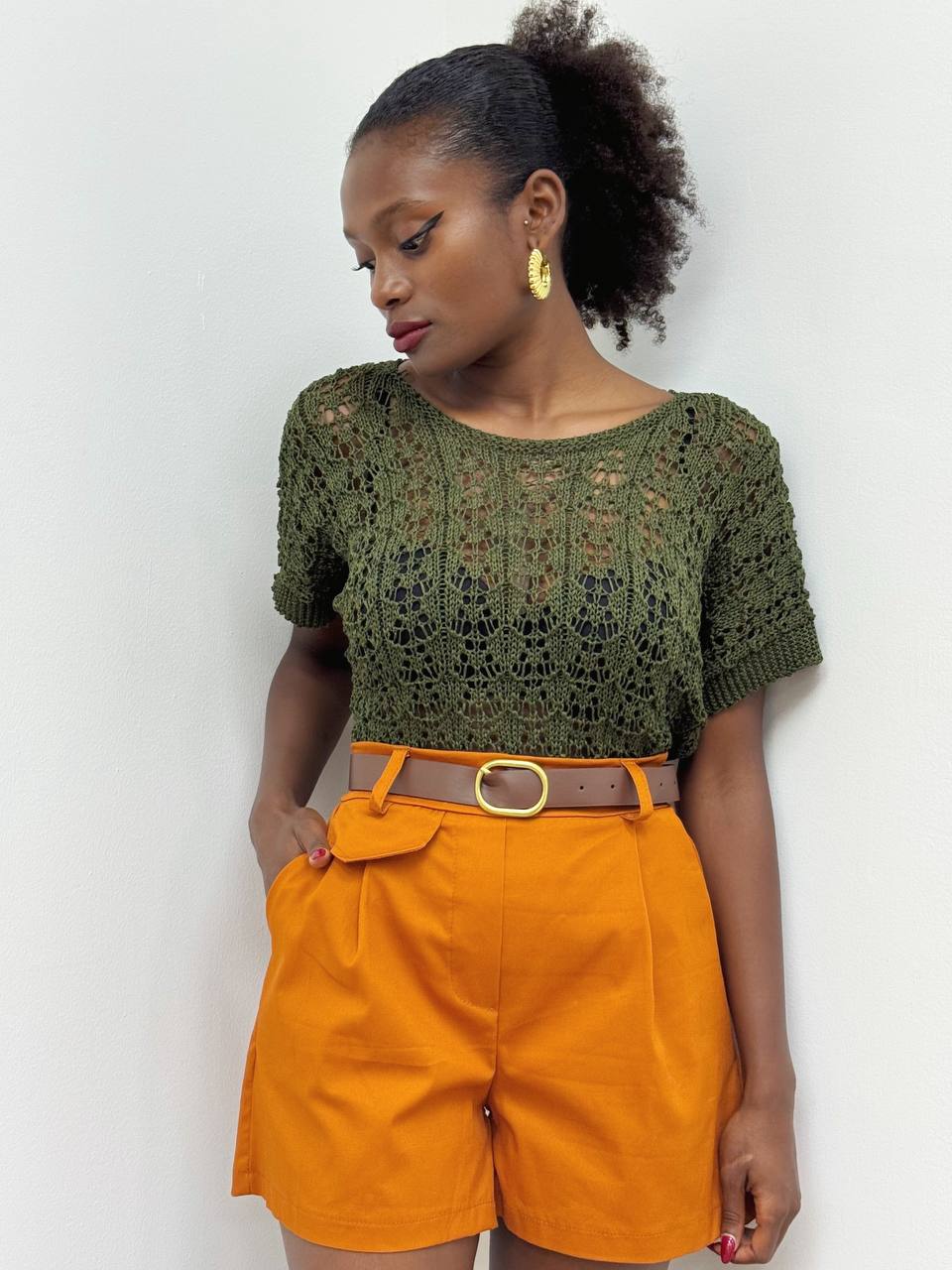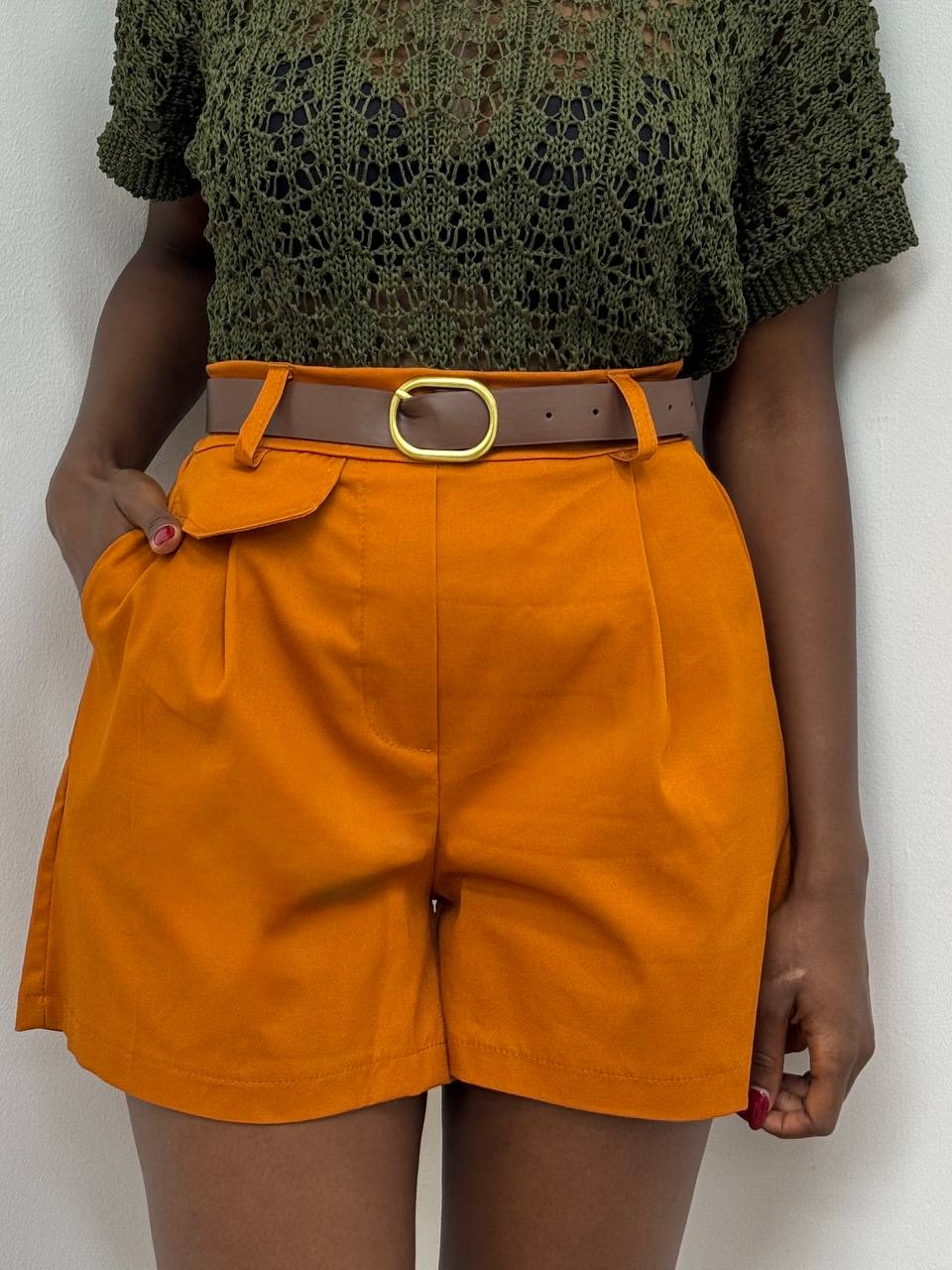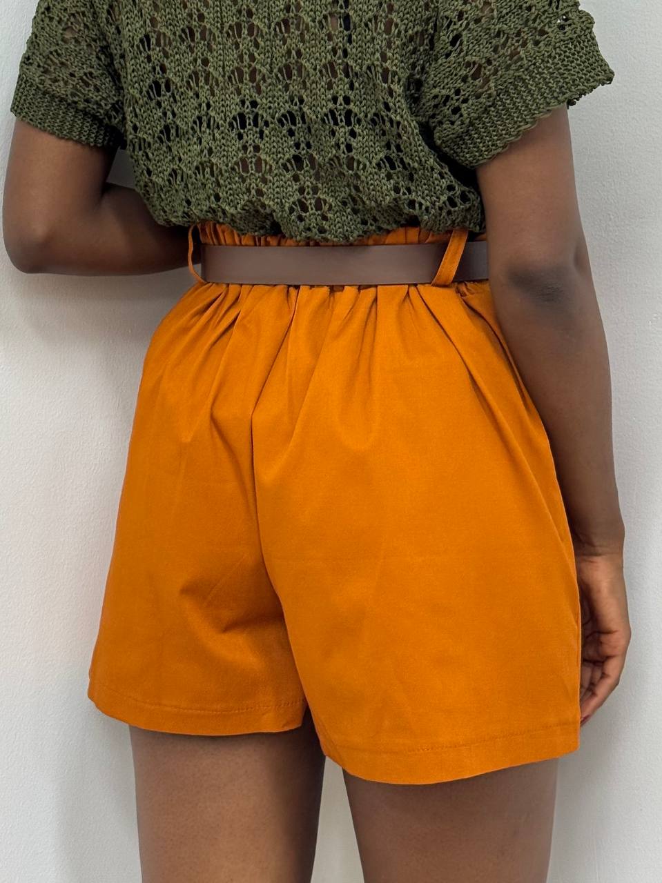 Shorts elasticizzato sul punto vita con cinturino allegato all’acquisto dello shorts con dettaglio di taschine laterali.