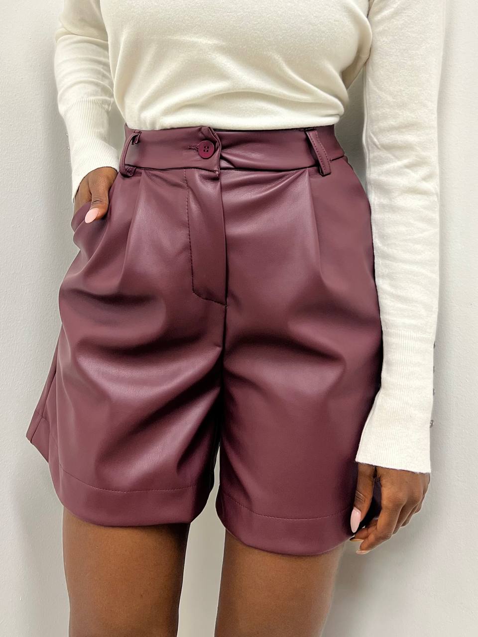 Shorts in ecopelle di alta qualità, dal design moderno e deciso, perfetti per look urbani e contemporanei. Il modello presenta chiusura frontale con bottone e zip, passanti per cintura e pratiche taschine laterali, unendo funzionalità e stile.