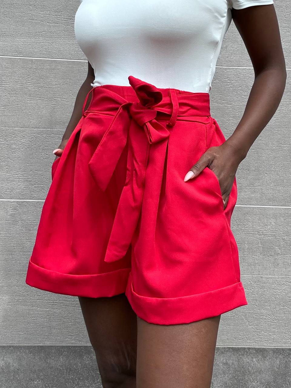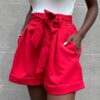 Shorts elasticizzato con dettaglio di fiocco sul punto vita a tinta unita con pince. Dettaglio di taschine laterali.