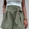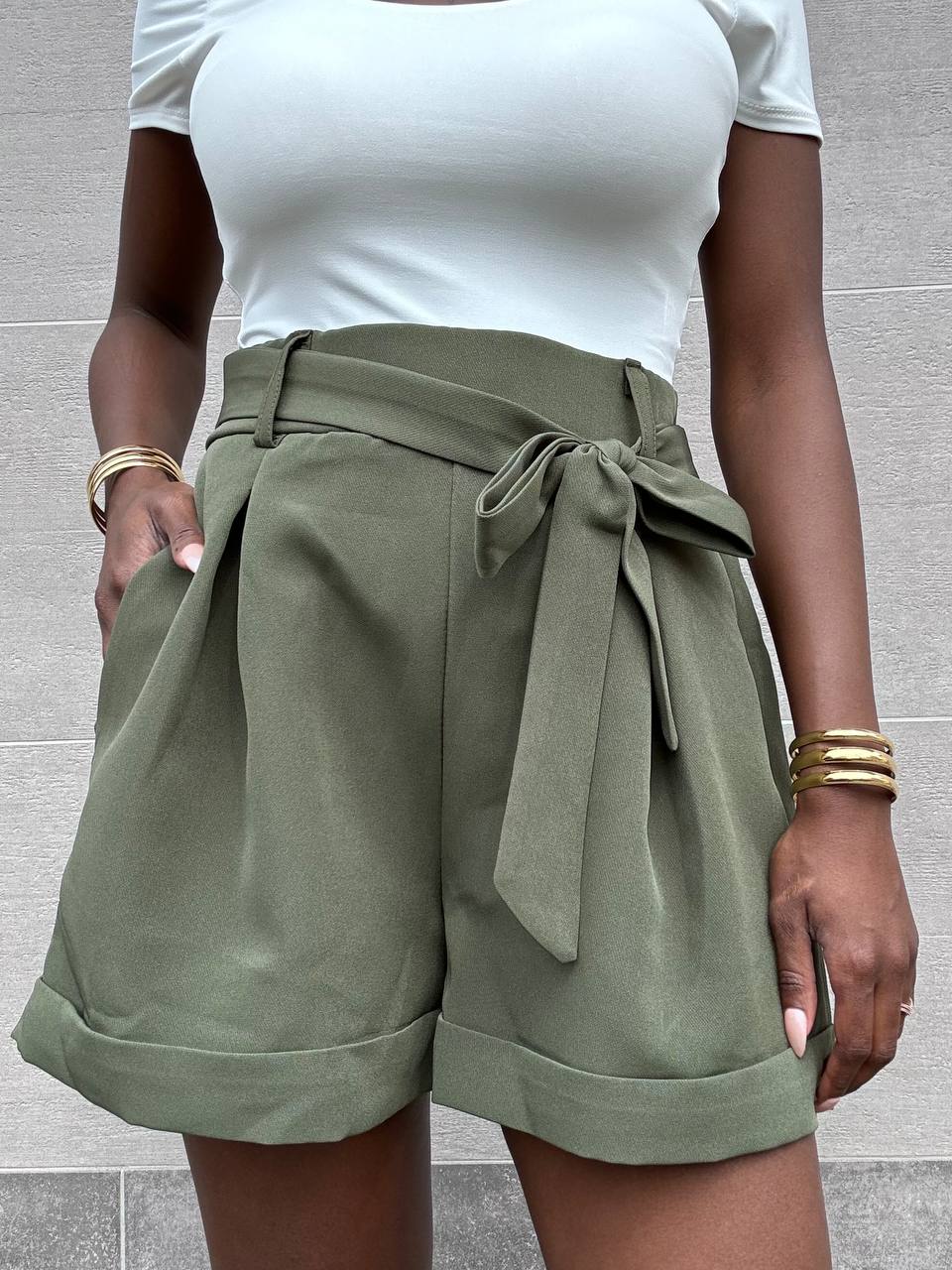 Shorts elasticizzato con dettaglio di fiocco sul punto vita a tinta unita con pince. Dettaglio di taschine laterali.