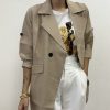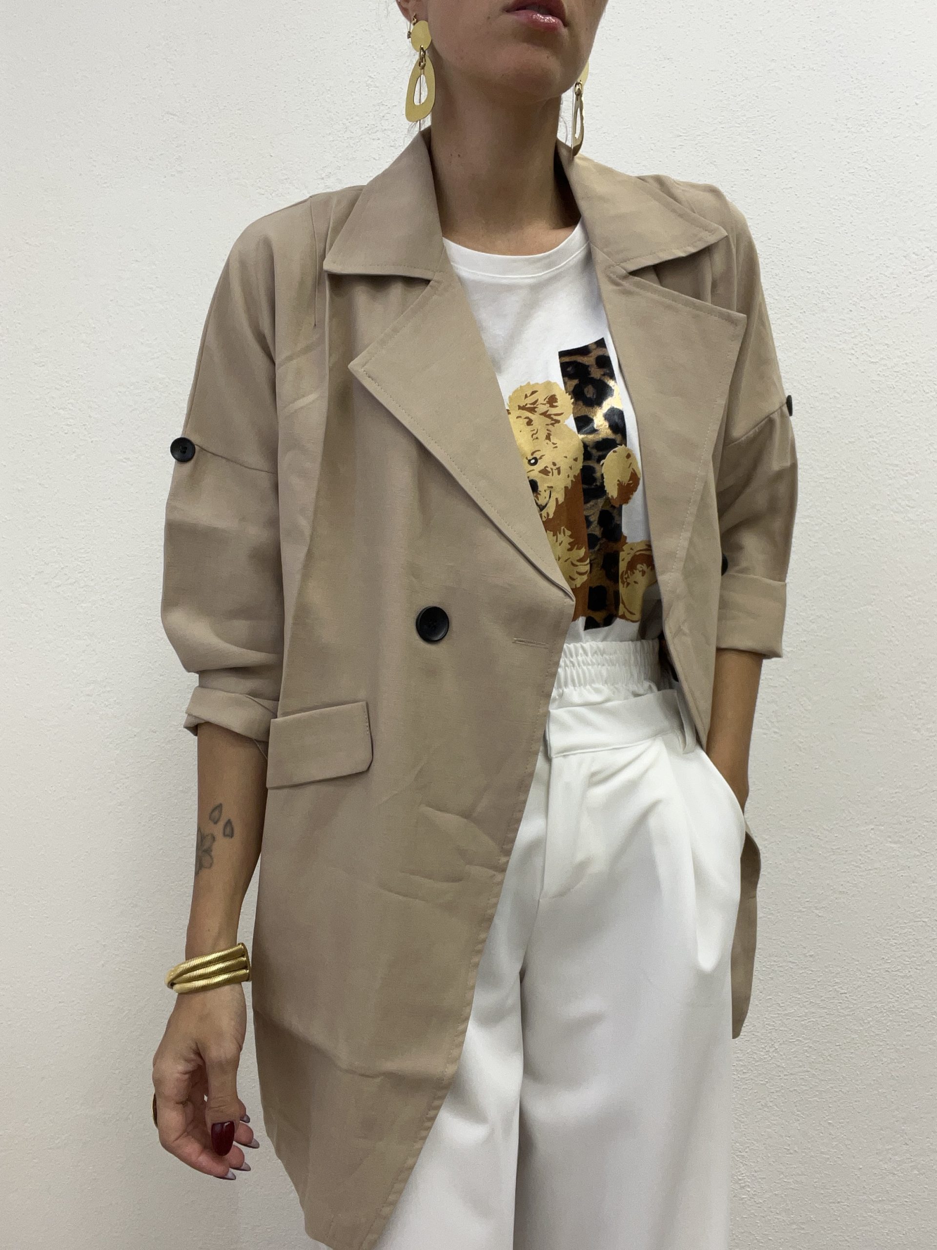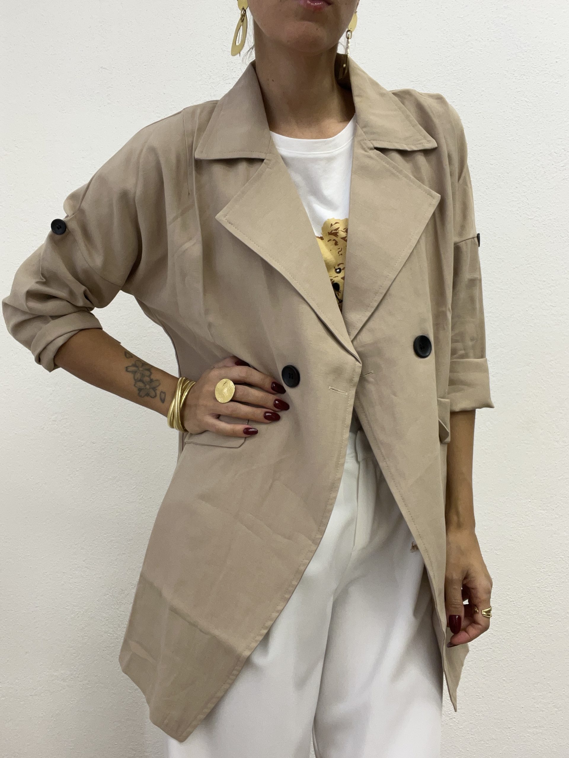 Spolverino con chiusura incrociata con bottoni di chiusura e dettaglio di taschine laterali.