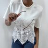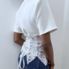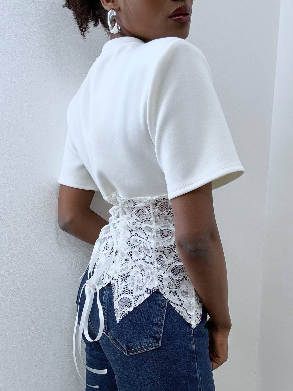 Il capo è impreziosito da un elegante corpetto in pizzo, che crea un raffinato gioco di trasparenze e texture, aggiungendo un tocco romantico e sofisticato. Sul retro, un delicato dettaglio di stringhe intrecciate completa il design con una nota moderna e seducente, rendendo la maglia perfetta sia per look casual chic che per occasioni più speciali.
