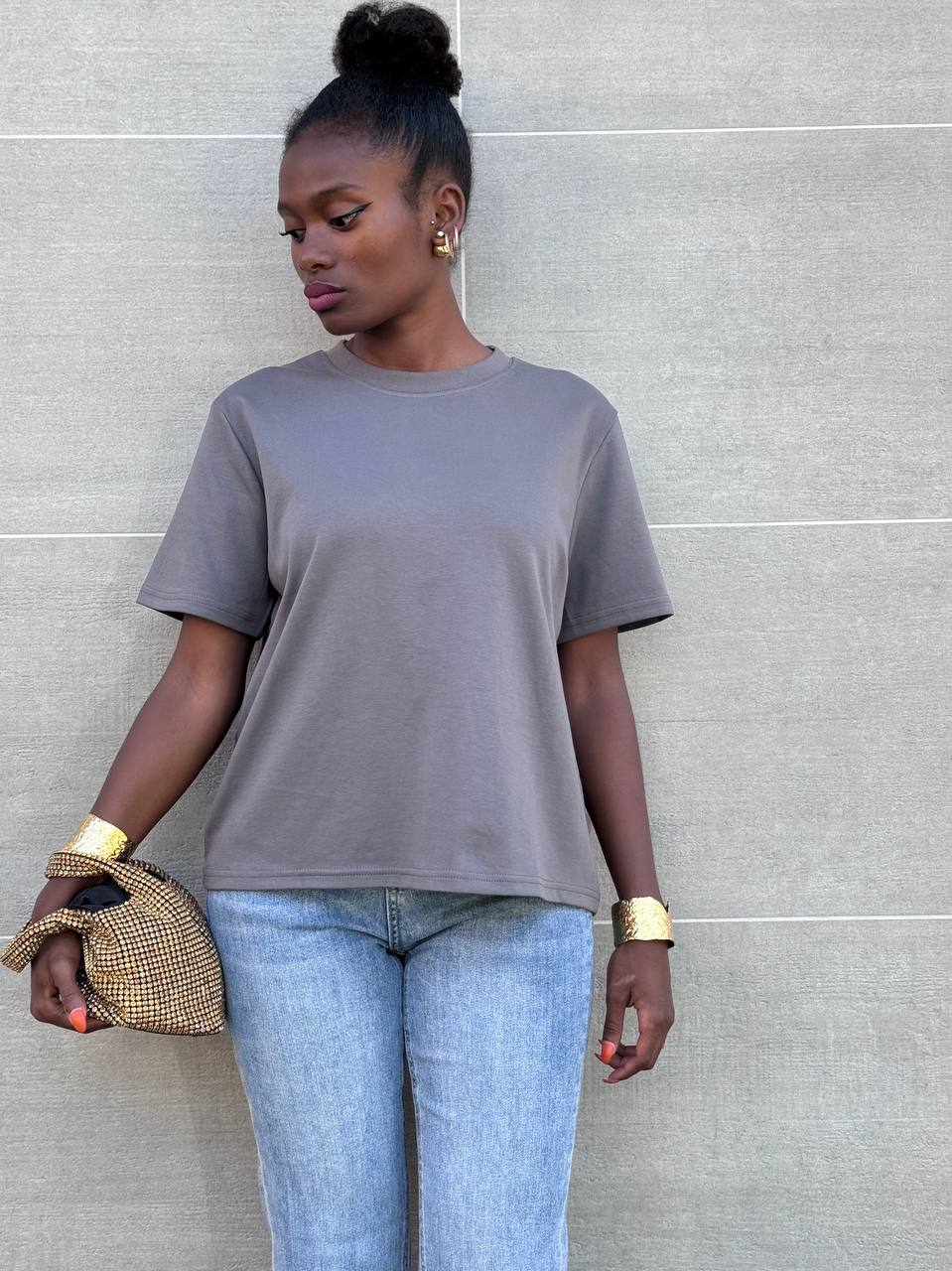 T-shirt oversize con scollo arrotondato, spalle basse e maniche corte a tinta unita.