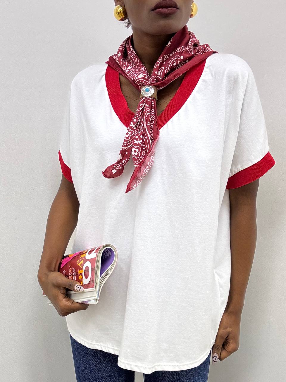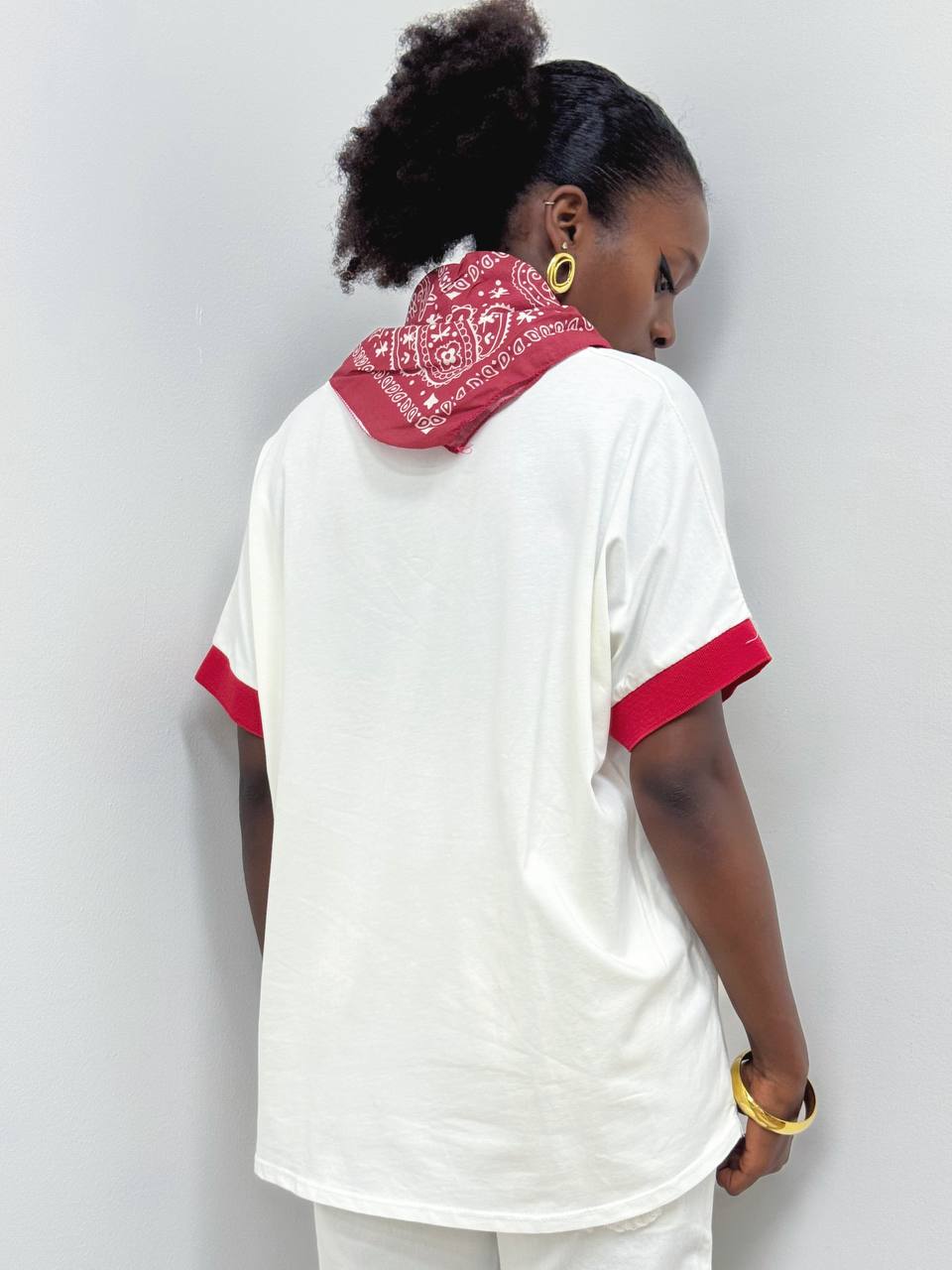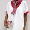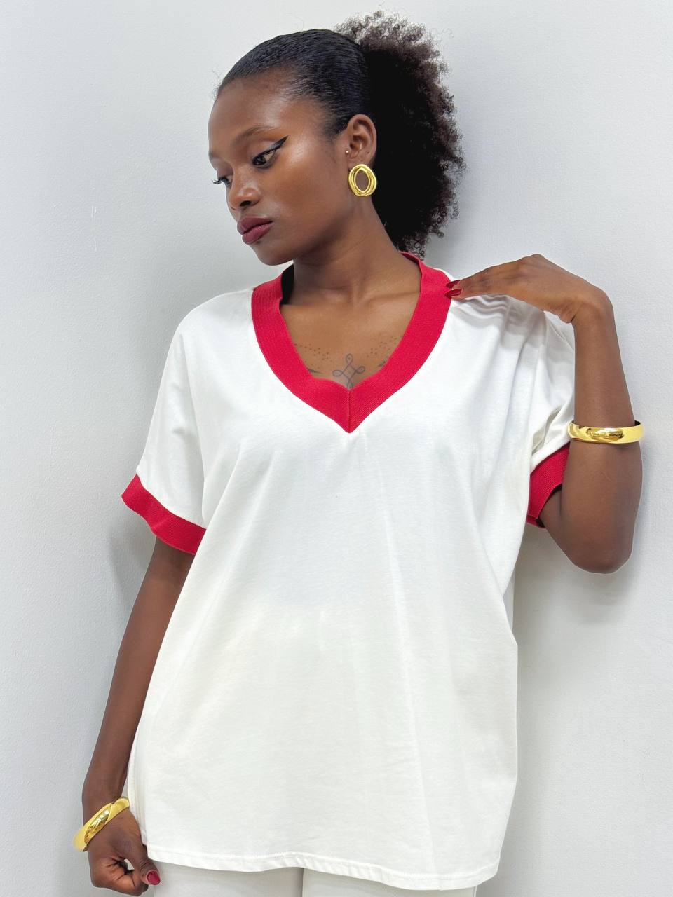T-shirt dallo stile raffinato e contemporaneo, caratterizzata da un elegante scollo a V che valorizza la linea del décolleté. Il design è impreziosito da inserti in tessuto rosso applicati sul colletto e sulle maniche, che creano un piacevole contrasto cromatico e donano un tocco di personalità al capo.