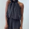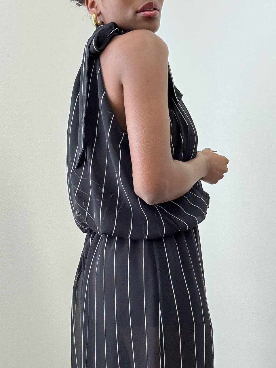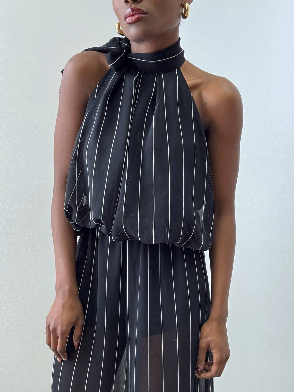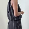 Top gessato smanicato a collo alto, arricchito da un fiocco di chiusura sulla parte posteriore che dona un tocco elegante e femminile. L’orlo a sbuffo con elastico interno aggiunge morbidezza e movimento, rendendo il capo versatile per look sia casual che più raffinati.