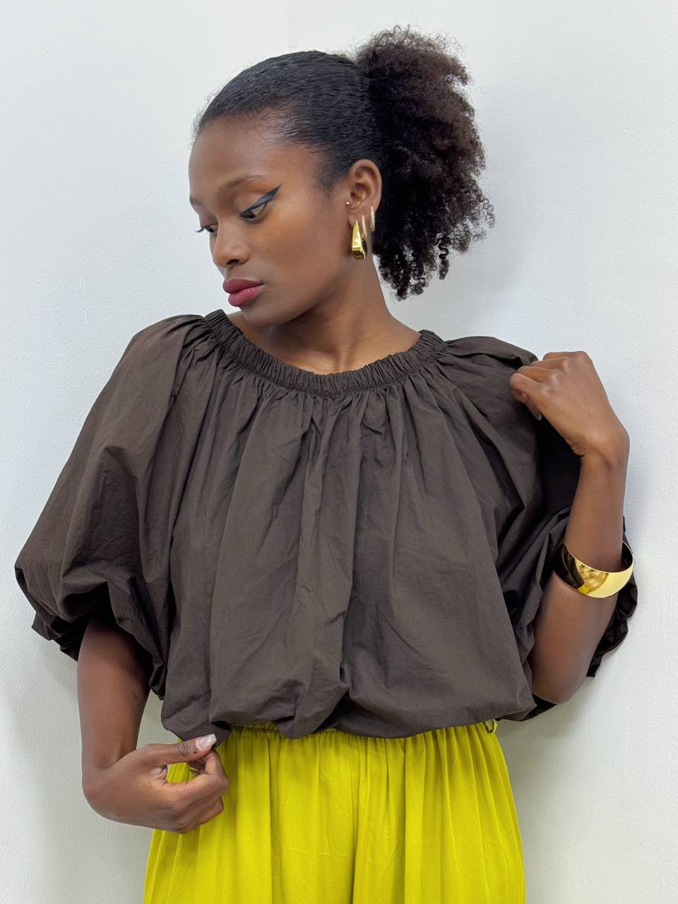 Top elasticizzato con maniche a sbuffo a tinta unita. Dettaglio di pince su tutta la lunghezza.