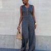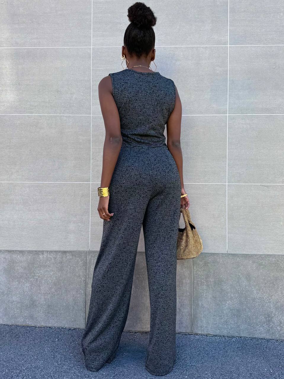 Tuta smanicata con scollo a V con dettaglio di bottoni gioiello sulla parte superiore a gamba larga.