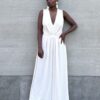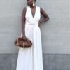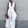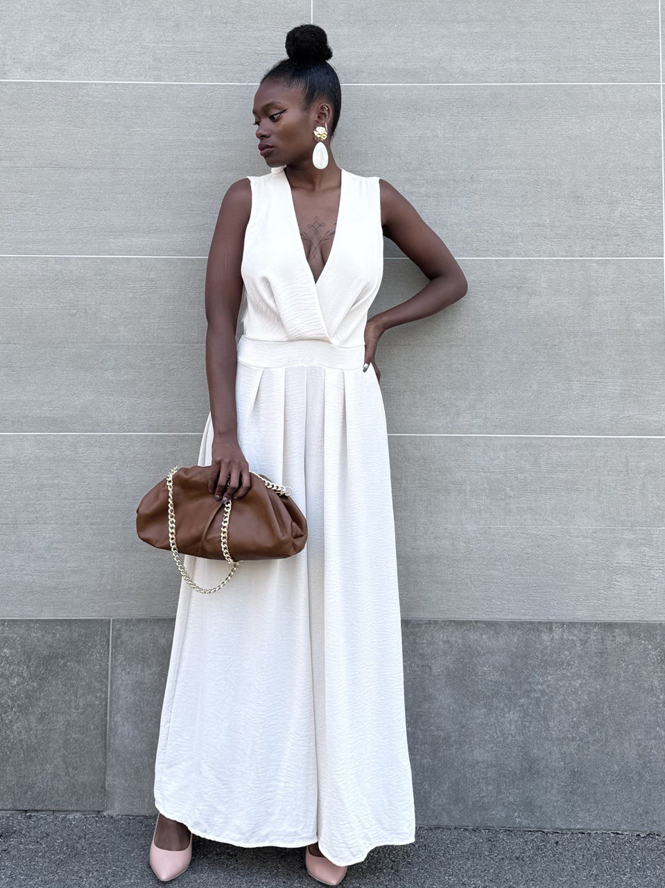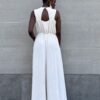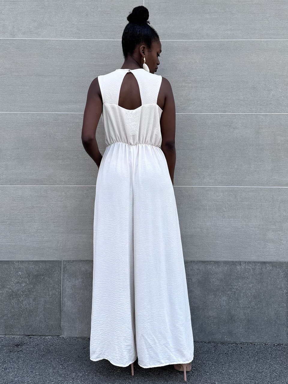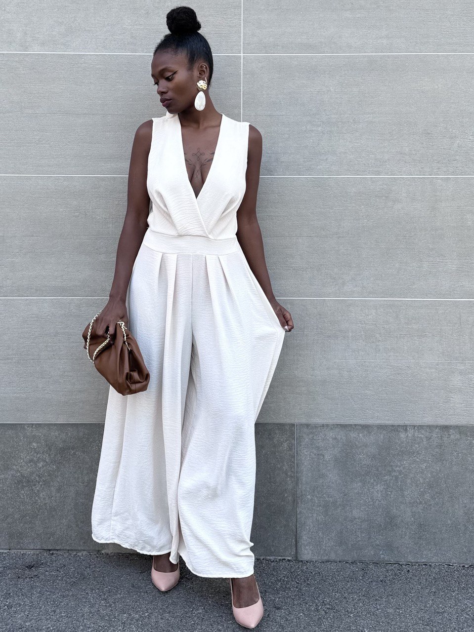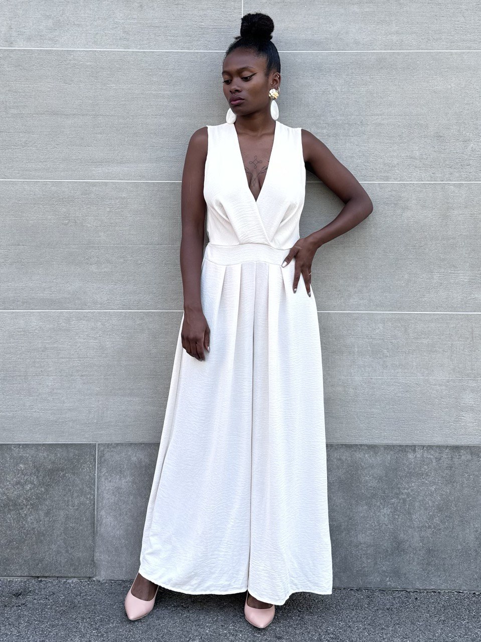 Tuta con spallina larga e scollo incrociata elasticizzata sul punto vita a gamba larga. Con chiusura posteriore da un piccolo bottone.