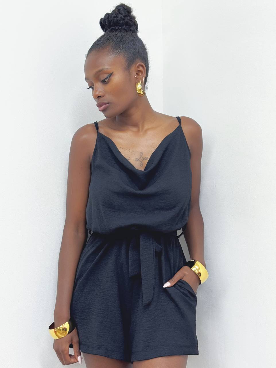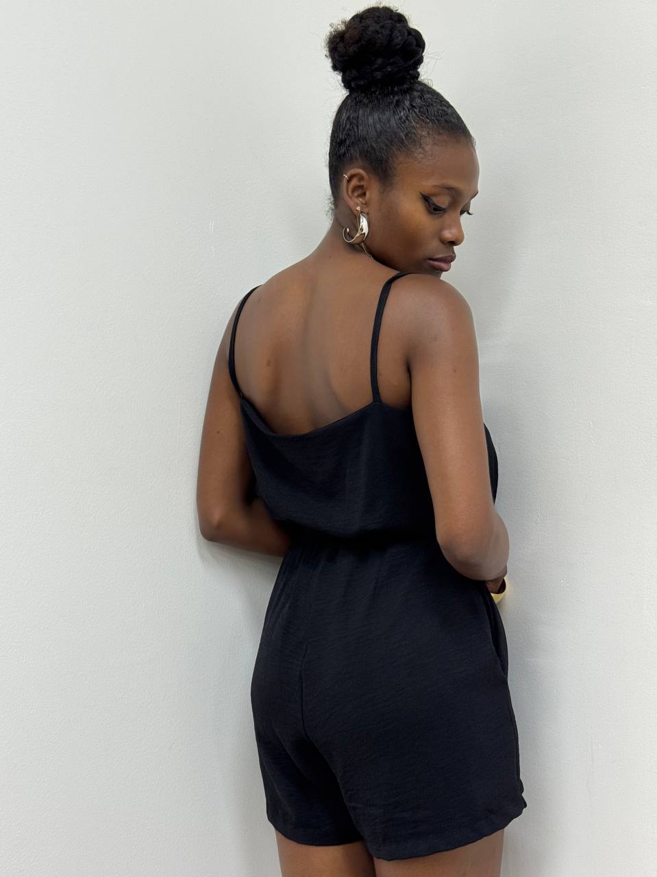 Tutina corta con scollo morbido e spalline sottili con cinturino annodato dello stesso tessuto a tinta unita.