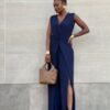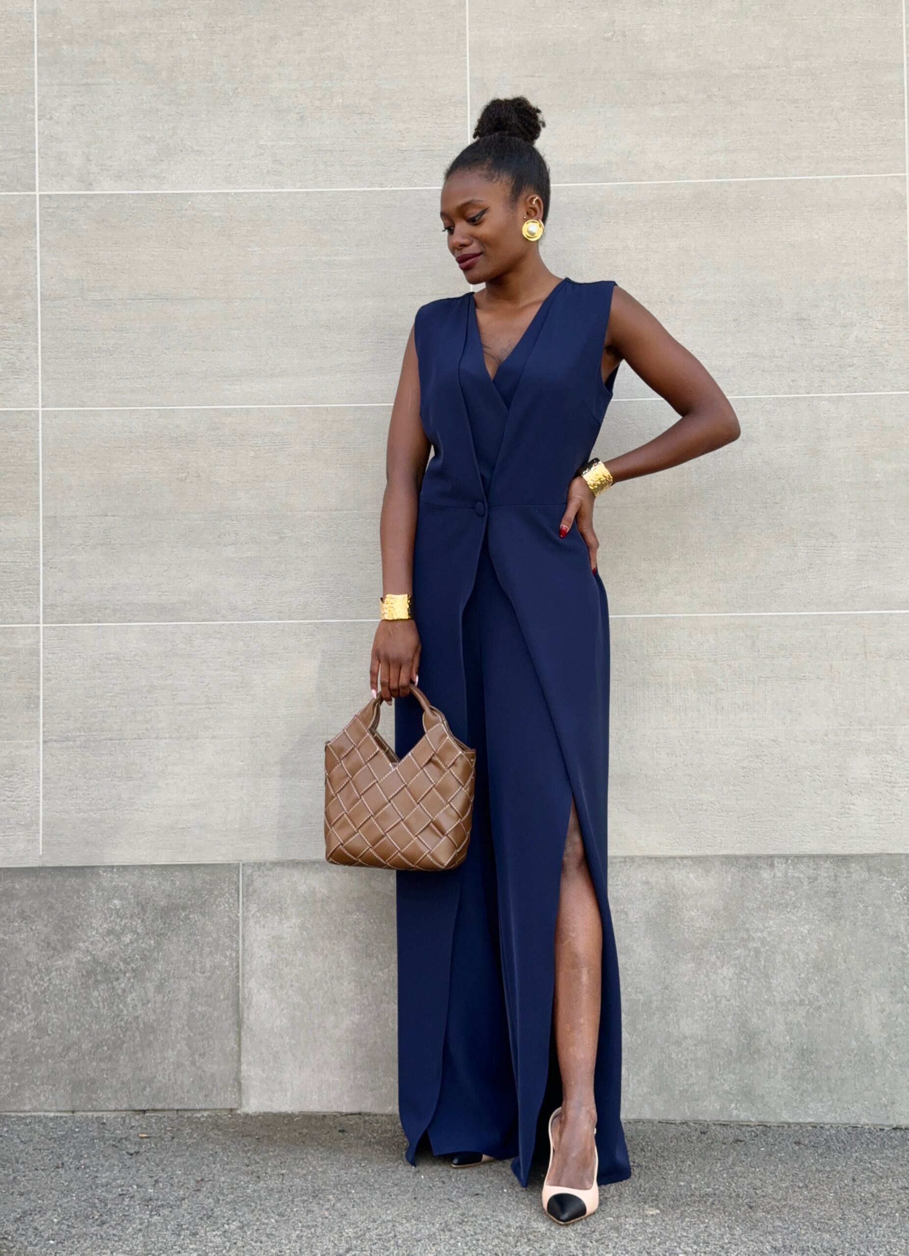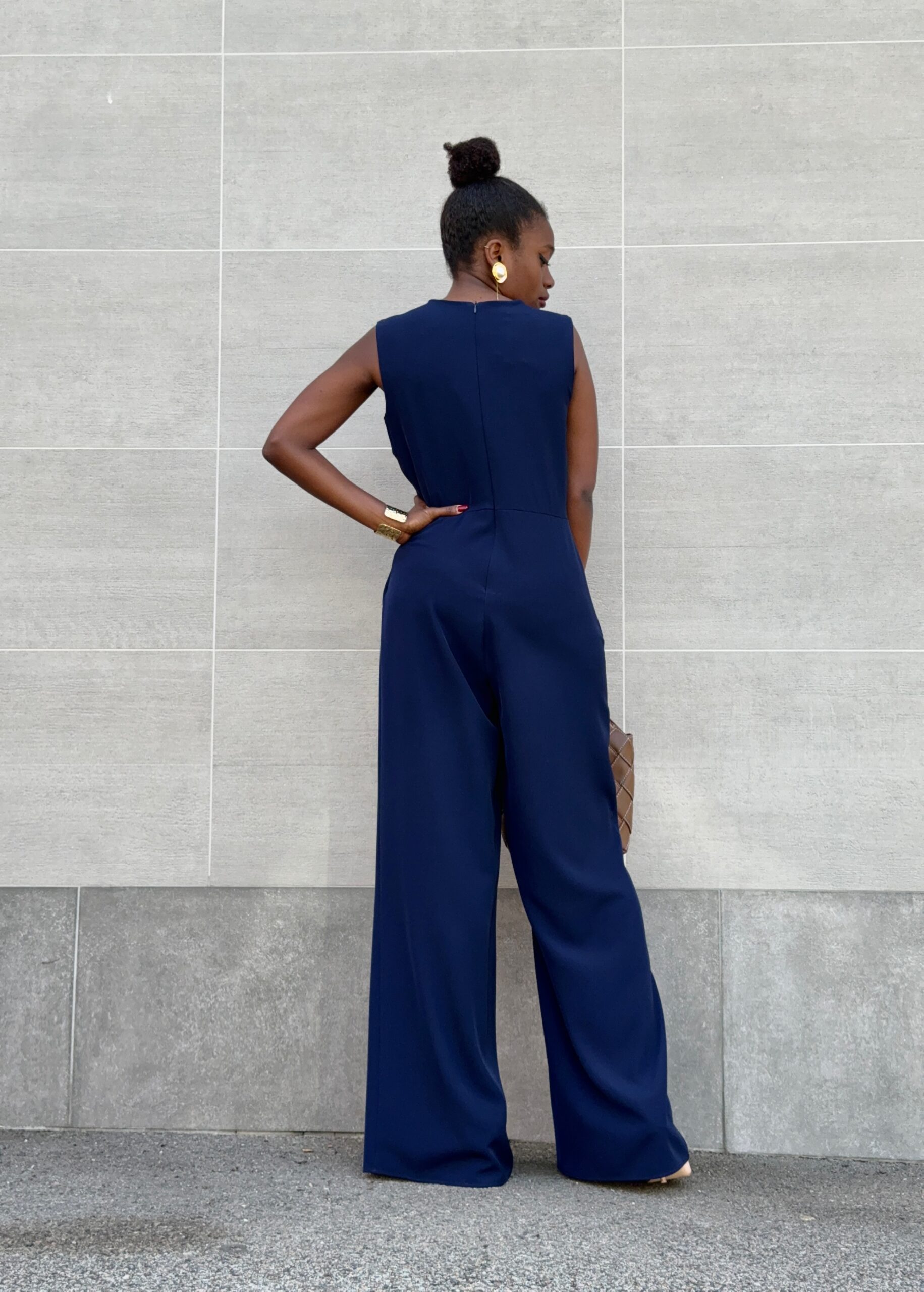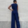Tuta lunga con scollo a V con dettaglio di bottone di chiusura centrale a palazzo a tinta unita. TESSUTO ELASTICIZZATO