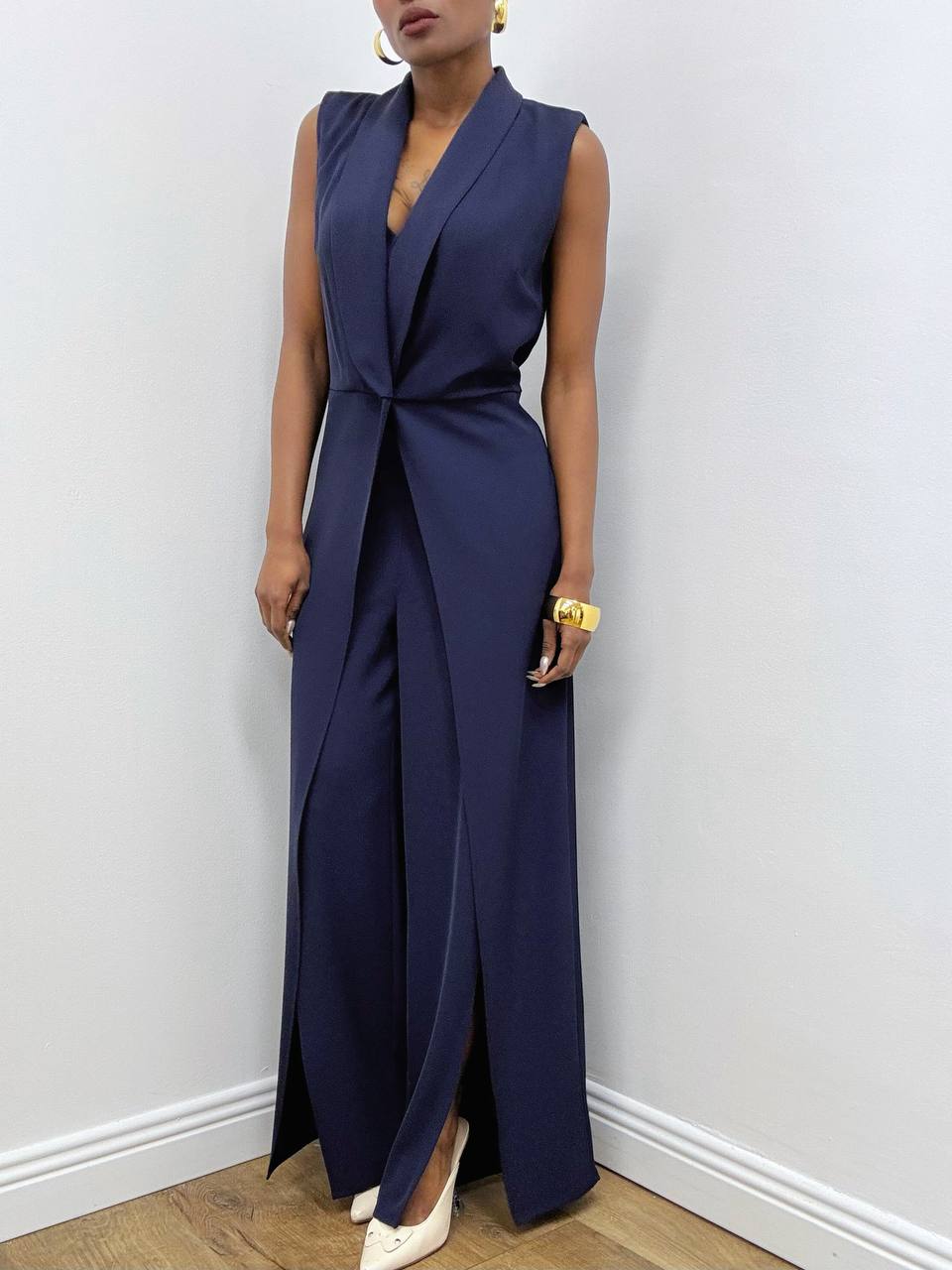 Tuta lunga elegante e versatile, caratterizzata da un raffinato scollo a V che valorizza la silhouette. Il design è impreziosito da un delicato dettaglio di bottone centrale, che aggiunge un tocco di stile e funzionalità alla chiusura.