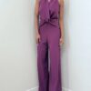 Il dettaglio nodo frontale impreziosisce il punto vita, creando movimento e definendo la silhouette con naturale eleganza. La gamba ampia scende fluida e leggera, regalando un effetto slanciato e una vestibilità confortevole.