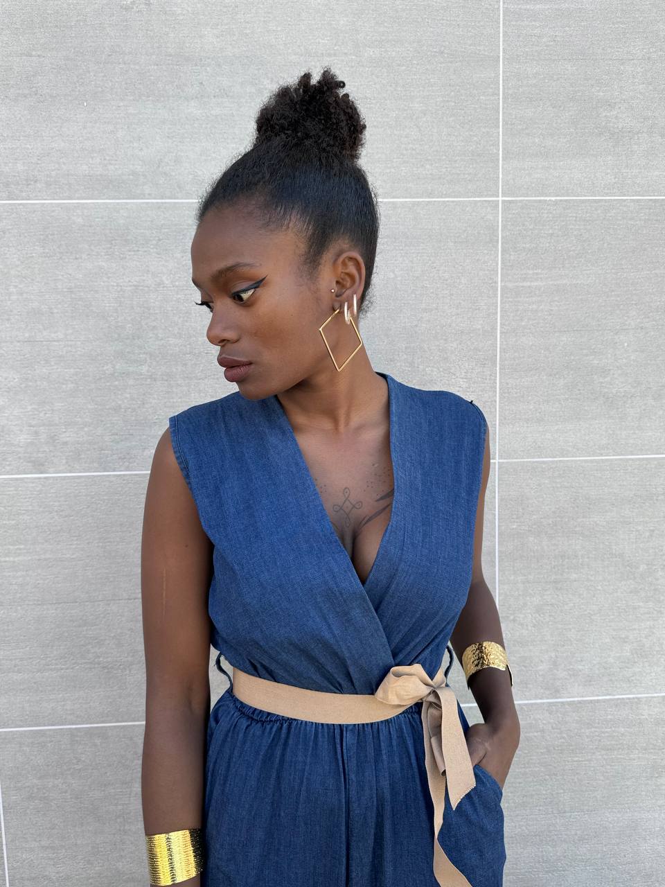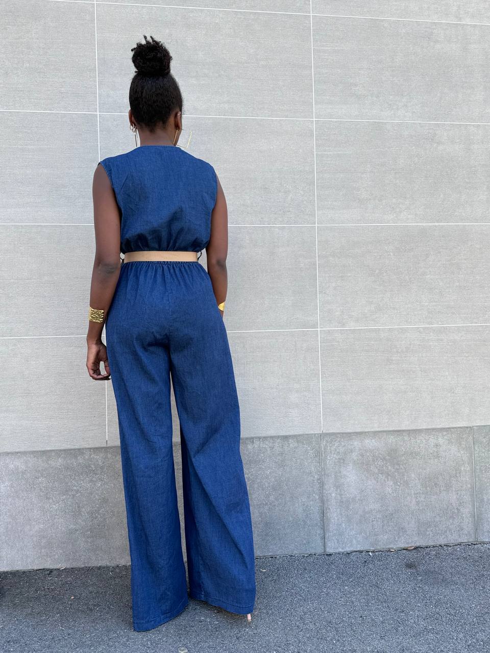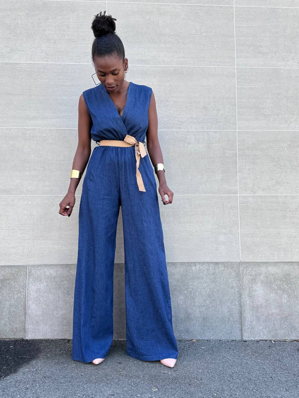 Tuta smanicata con dettaglio di pantalone a palazzo ed elastico in vita. Cinturino allegato e scollo a V incrociato.