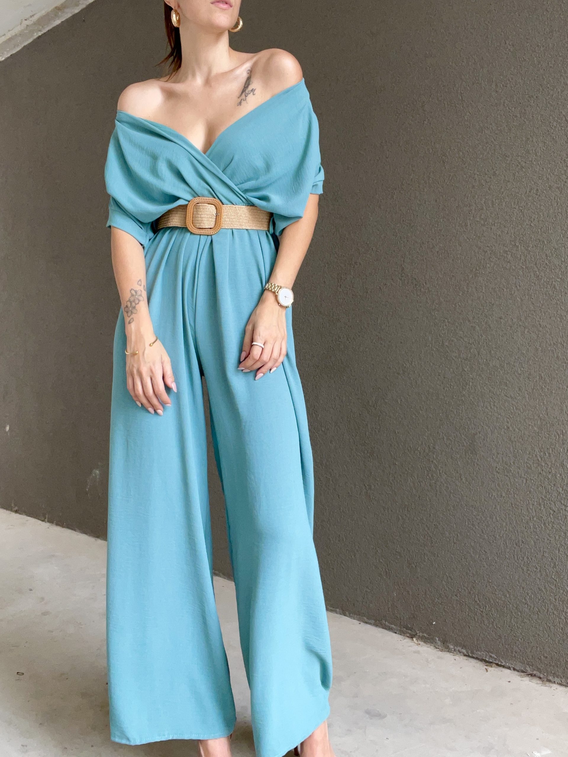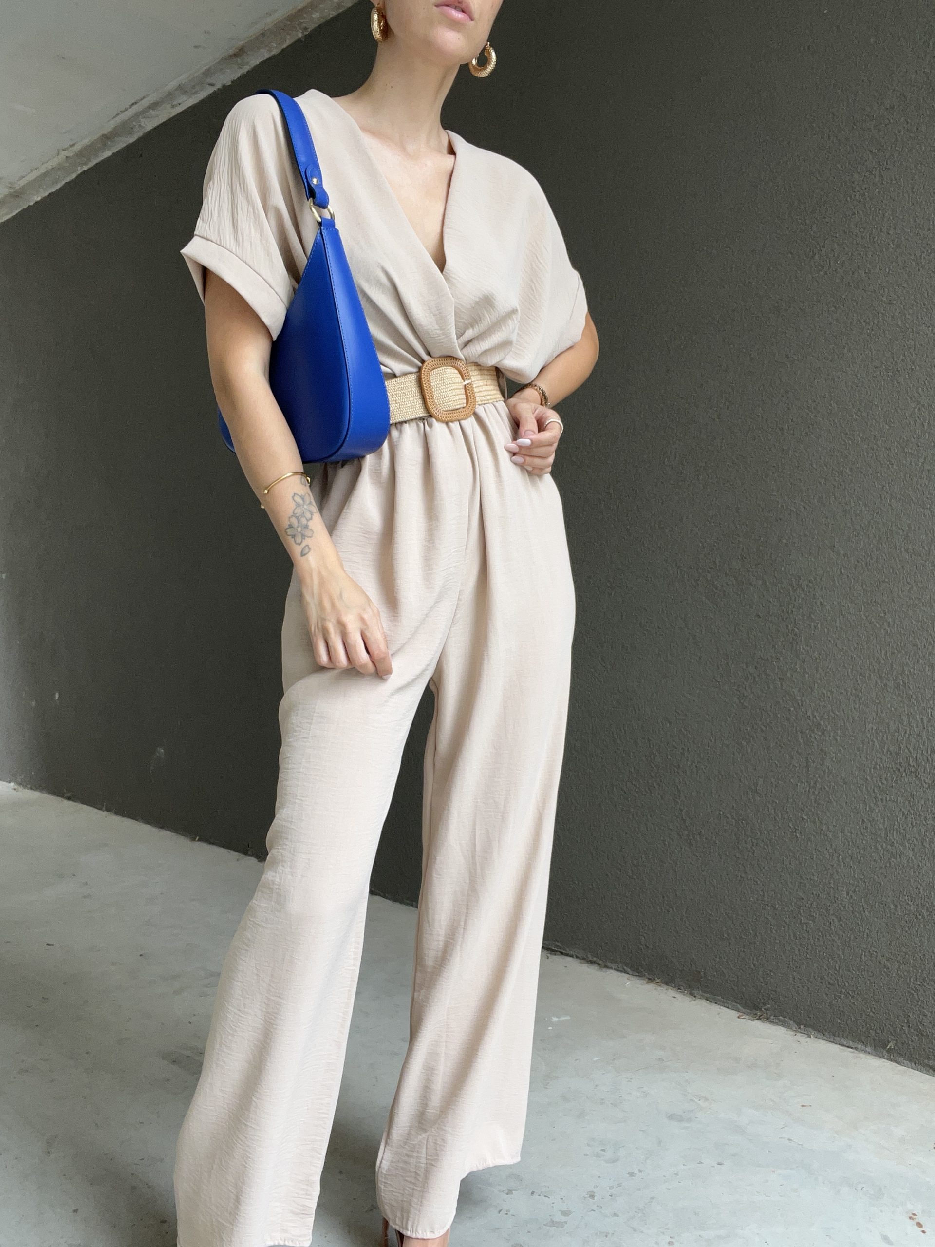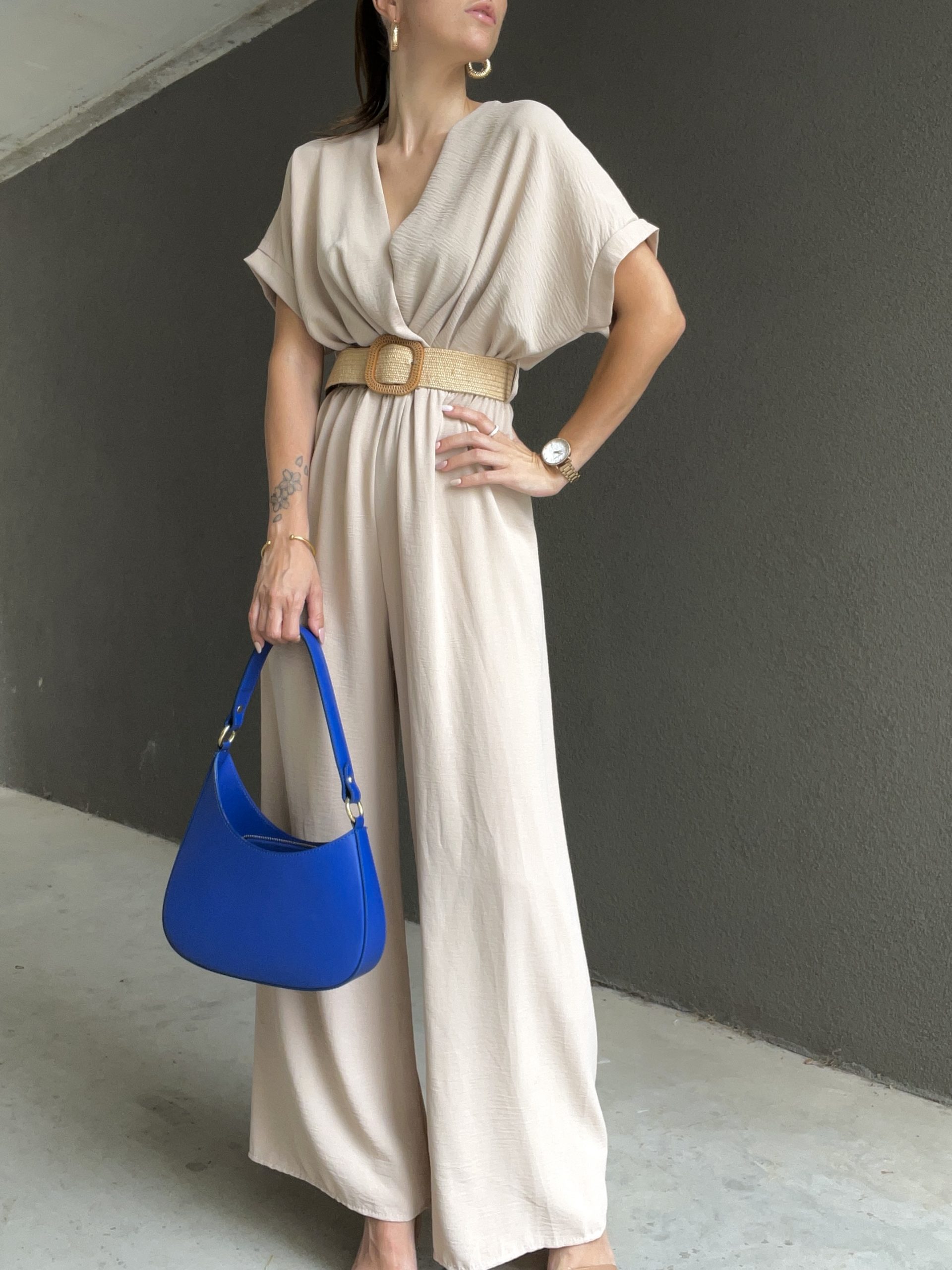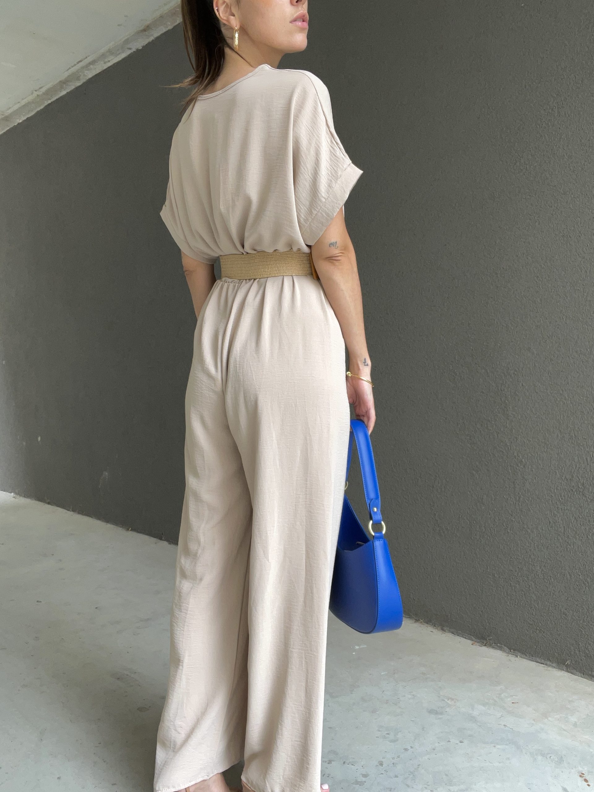 Tuta intera con vita elasticizzata che permette di vestire da una taglia 38/40 ad una taglia 44/46. Pantalone morbido. Tessuto fresco ed elasticizzato.