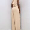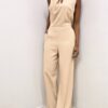 Tuta smanicata dal design moderno ed elegante, caratterizzata da un pantalone a gamba larga che dona movimento e slancia la silhouette. Il punto vita è elasticizzato per garantire comfort e vestibilità perfetta, valorizzando le forme con naturalezza. Dotata di pratiche taschine laterali, unisce stile e funzionalità. Il collo presenta una delicata chiusura con fiocco, che aggiunge un tocco femminile e raffinato. Completa il capo uno scollo a V, discreto ma sensuale, capace di esaltare il décolleté con eleganza. Pancino compatibile.