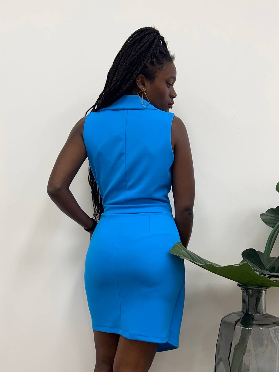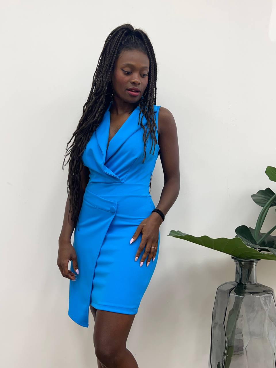 Abito smanicato con scollo a V con chiusura di un bottone sulla parte centrale.