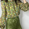 Camicia crop a girocollo, con spalle imbottite ,foderata ed elasticizzata sulla parte finale e sui polsini ,con bottone nella parte posteriore e dettaglio di cuori colorati.